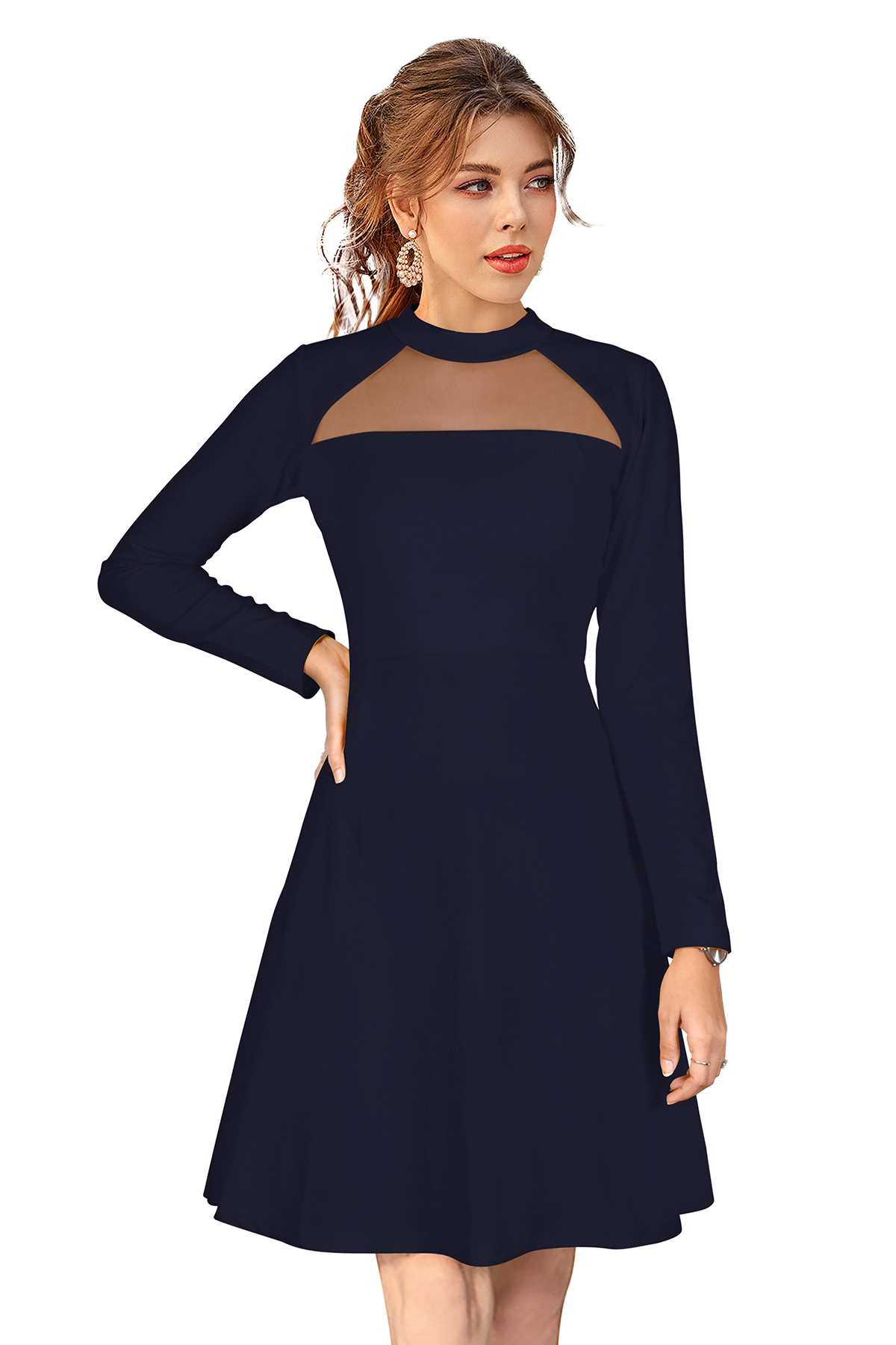 Elegant Navy Blue Full-Sleeve Stretchable Fit & Flare Dress