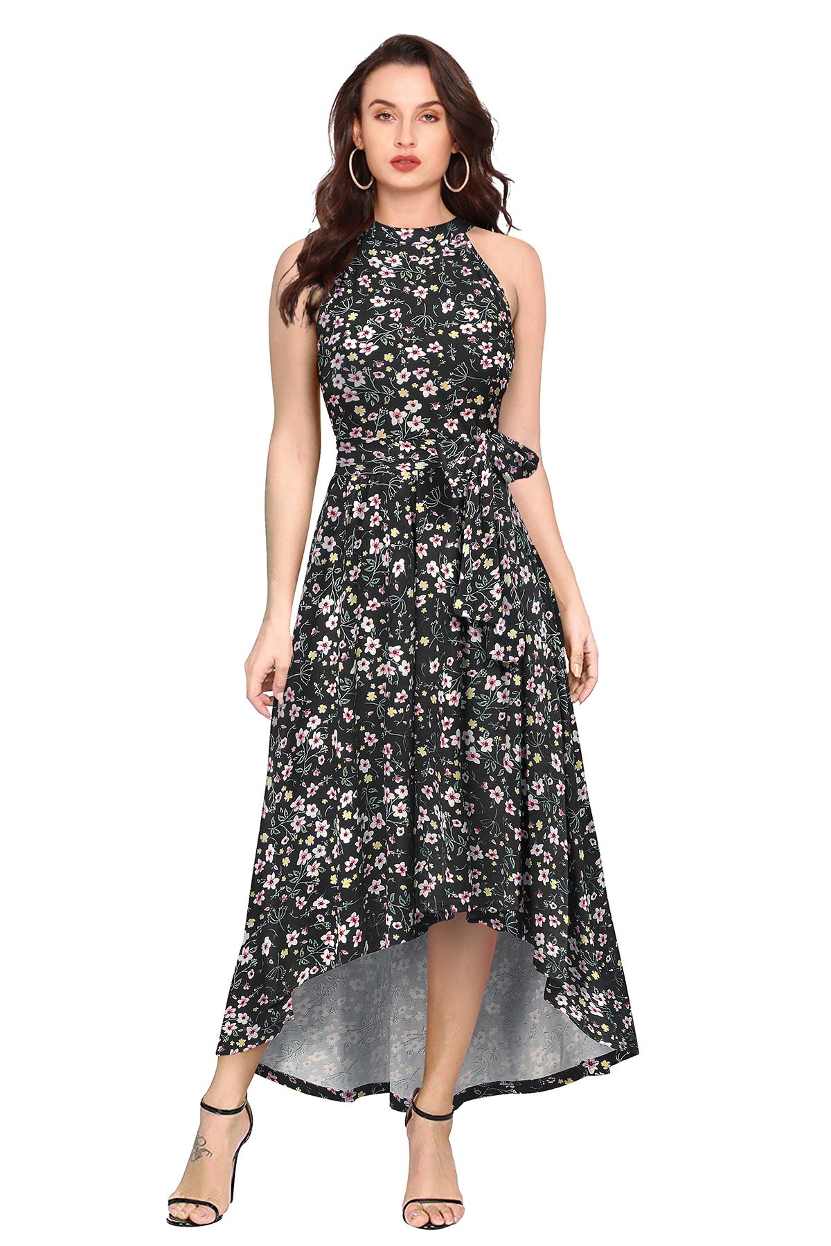 Be the first to review “Flower Print Black Sleeveless Helter Neck Dress”