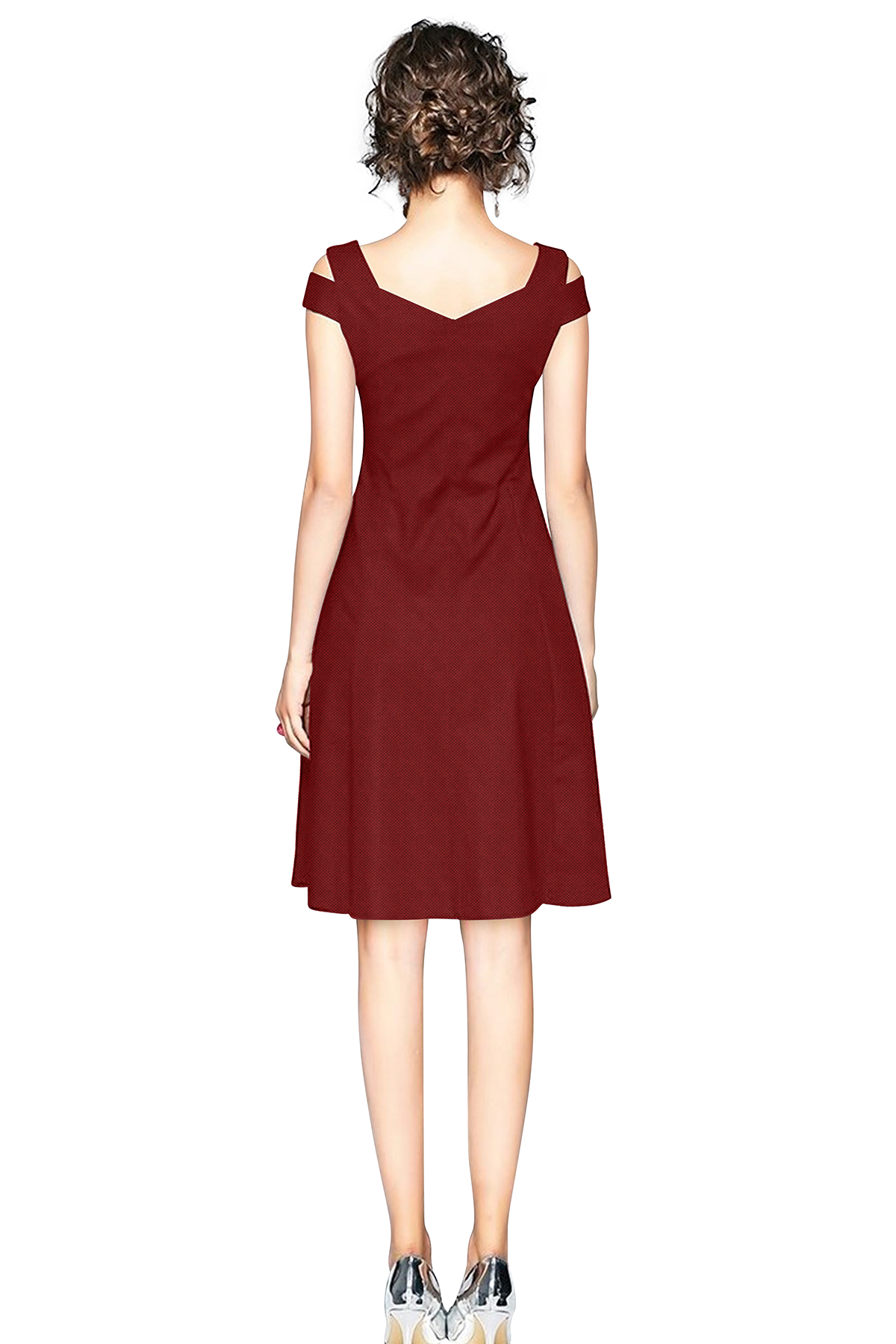 Maroon Off-Shoulder V-Neck Knee-Length Dress