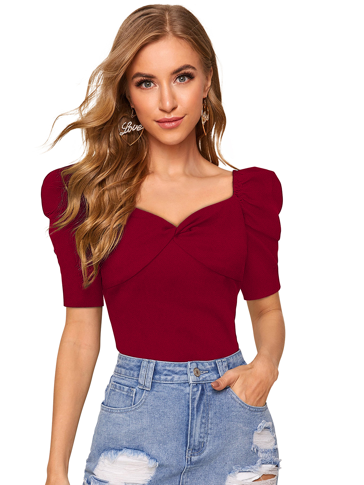 Short Sweet Heart Puff Sleeves Maroon T-shirt